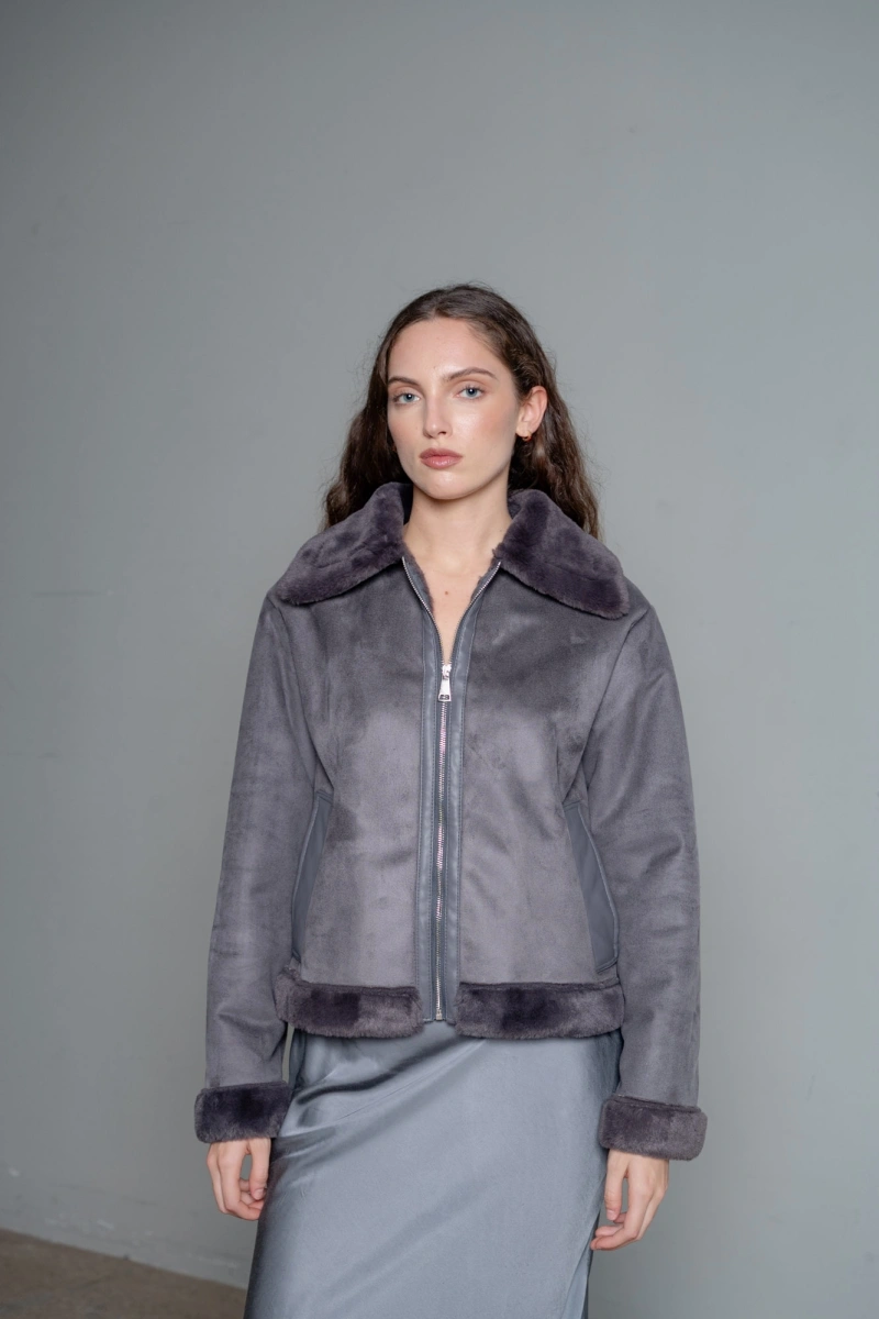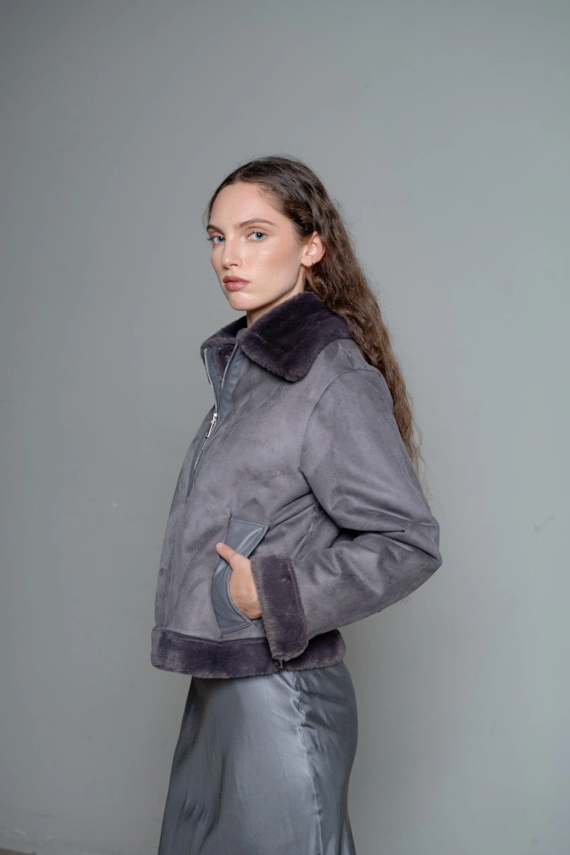 Giacca corta in ecomontone con dettagli in ecopelle
